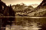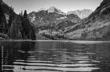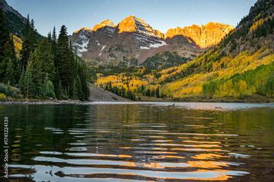 Maroon Bells at sunrise. Bell-shaped peaks in the Elk mountains with yellow aspen forest over the lake. Famous autumn landscape during fall foliage in Colorado, USA