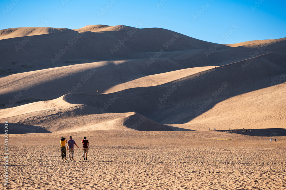 Tourists walking on desert landscape at Great Sand Dunes National Park in Colorado, USA. Curves of sand dunes casting shadow against the clear blue sky. The tallest dunes in North America
