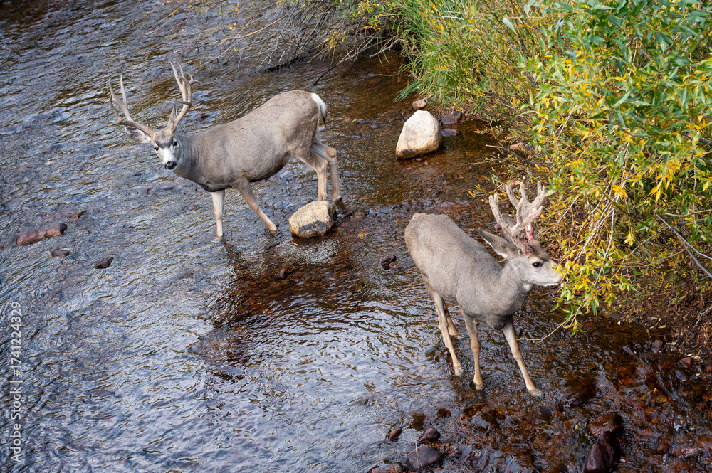 Two mule deer buck with impressive antlers crossing the creek. Wildlife animal at Rocky Mountain National Park, Colorado, USA