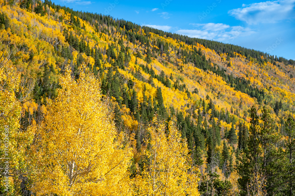 Fall foliage scenery of yellow aspen trees and green pine forest on the hill at Rocky Mountain National Park. Beautiful autumn landscape in Colorado, USA.