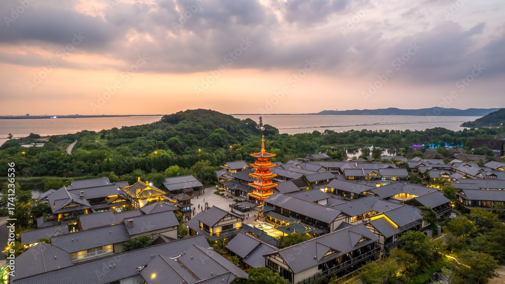 Aerial view of traditional buildings and a pagoda at dusk by the water