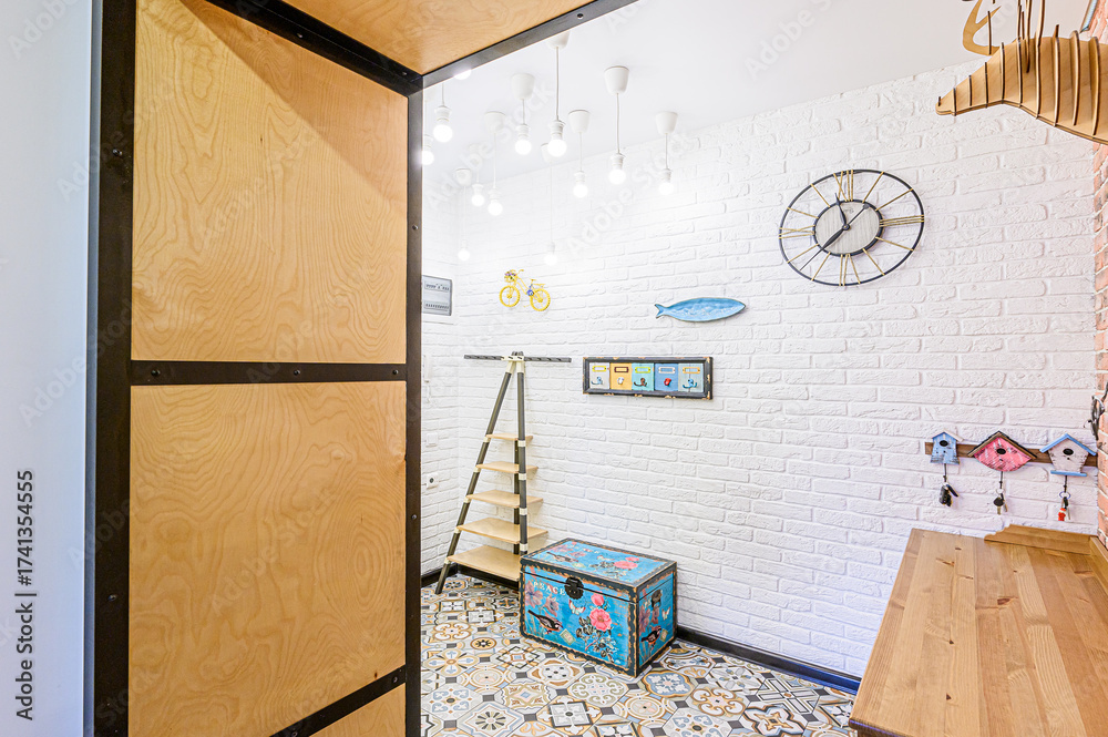 A cozy room with a white brick wall, decorated with quirky items like a clock, wooden deer head, and birdhouses. A wooden trunk sits on a patterned floor, creating a whimsical, inviting space