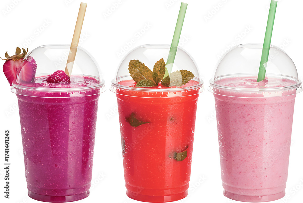 Refreshing Trio of Vibrant Fruit Smoothies in Clear Cups, Perfect for a Healthy Summer Drink