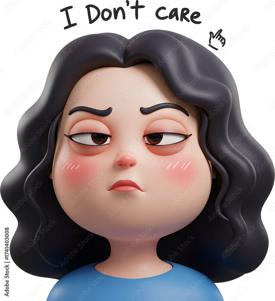 Cute 3D Cartoon Girl with Indifferent Expression, Wavy Hair, and 'I Don't Care' Text