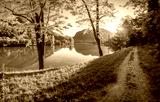 Scenic autumn view of a river with mountains reflected in calm water. Trees with golden foliage line a countryside path at sunset in Slovenia. Vibrant seasonal colors and peaceful nature in fall