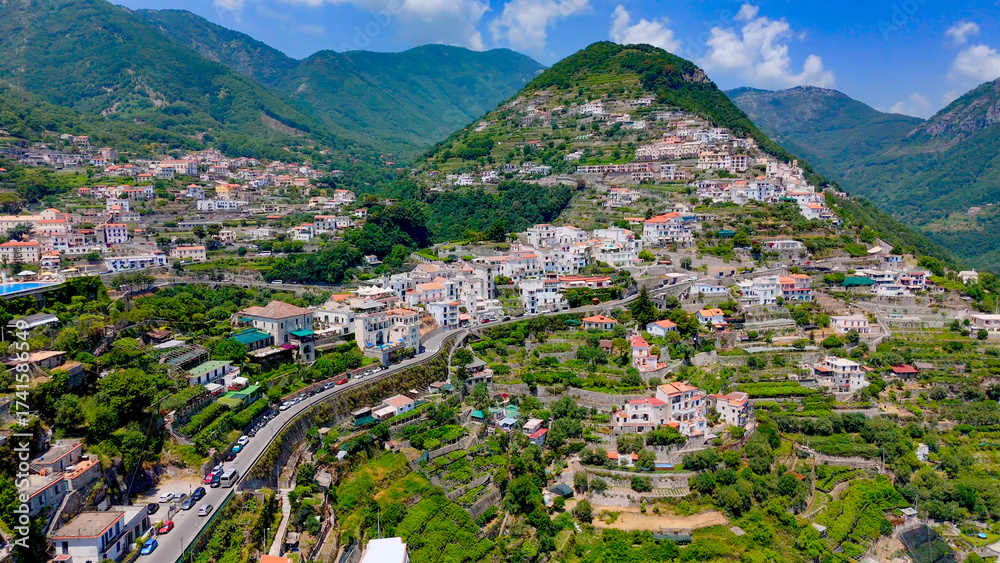 Ravello, Campania, Italy, aerial drone view.