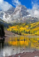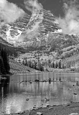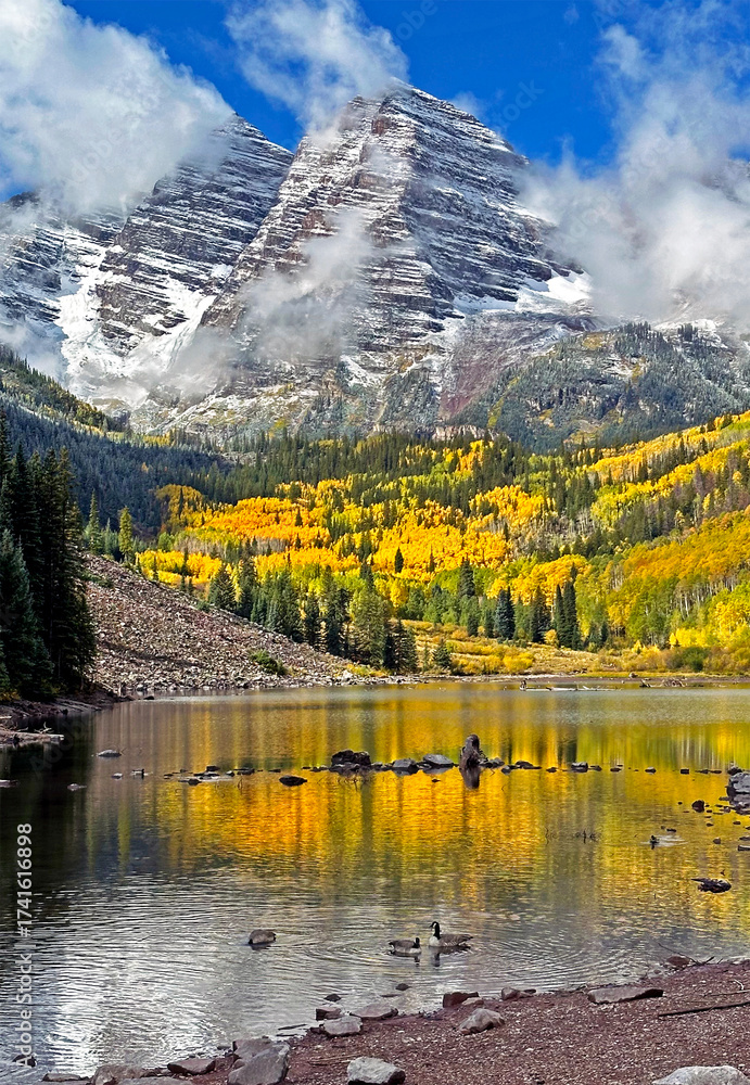 Canada geese in Colorado's Maroon Lake near Aspen, with Maroon Bells in the background