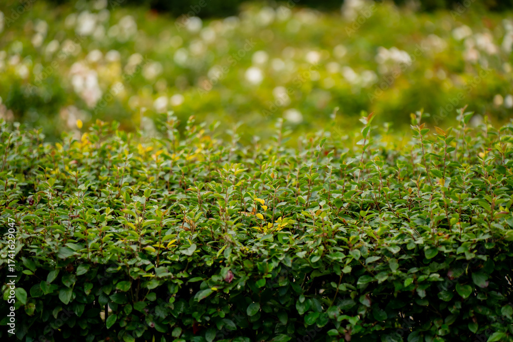 Well-maintained green hedge with soft blurred garden background illustrating landscape design, plant texture, garden maintenance and natural symmetry in outdoor greenery composition
