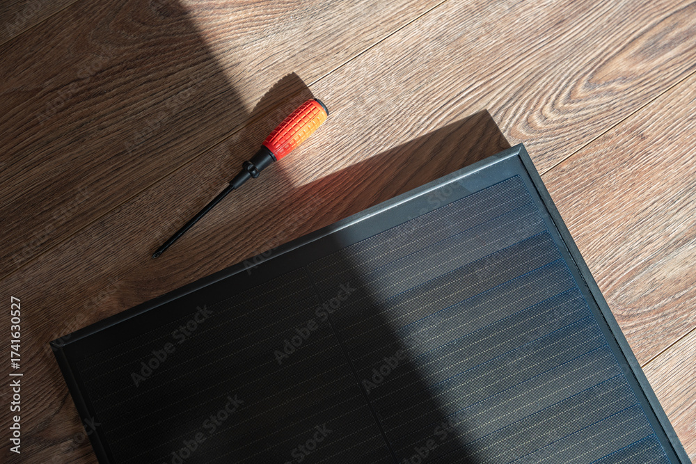 Solar panel repair and service with screwdriver on wooden floor. Renewable electricity, clean energy, eco friendly technology and sustainable power concept.