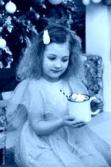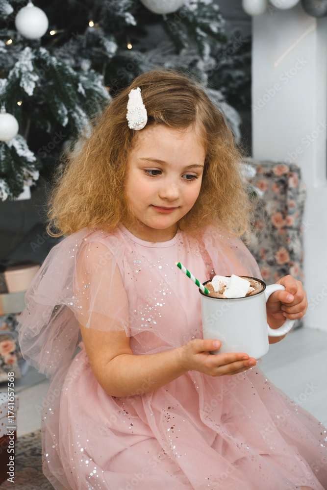 Child holding hot chocolate with marshmallow near Christmas tree at home. Girl enjoying hot drink near tall tree in the decorated room.
