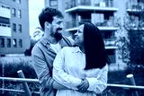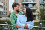 An interracial millennial couple smiles while looking at each other outdoors, showing affection, romance and connection in a modern urban lifestyle setting.