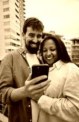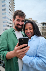 Vertical. Interracial couple smiling while using a smartphone outdoors in a vibrant city park, sharing a joyful moment of connection and happiness as they enjoy each other's company