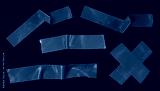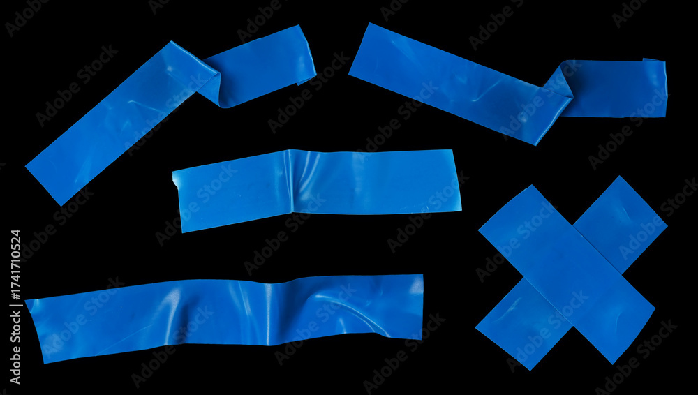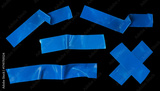 Blue insulating tape design elements. Blue tape texture isolated on black background. Adhesive tape parts