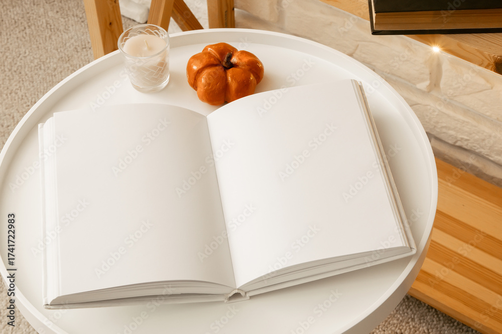 Open white empty paper pages of book or textbook mockup with space for text and design lies with small pumpkins on small white table next to wooden shelf in room.