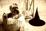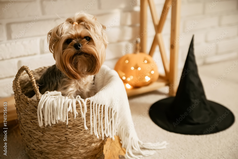 Cute Yorkshire Terrier dog sits inside a wicker basket with a knitted blanket against the background of a wooden shelf with a pumpkin lantern for Halloween and a black witch hat lying on the floor.
