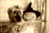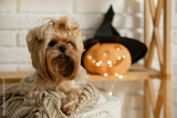 A Yorkshire Terrier dog sits on a knitted blanket against the background of a wooden shelf with a pumpkin lantern for Halloween in the room.