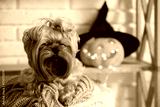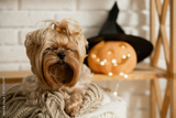 A Yorkshire Terrier dog sleeping on a knitted blanket against the background of a wooden shelf with a pumpkin lantern for Halloween in the room.