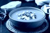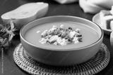 Butternut squash pumpkin soup with granola in a bowl on black background, Homemade food in autumn season