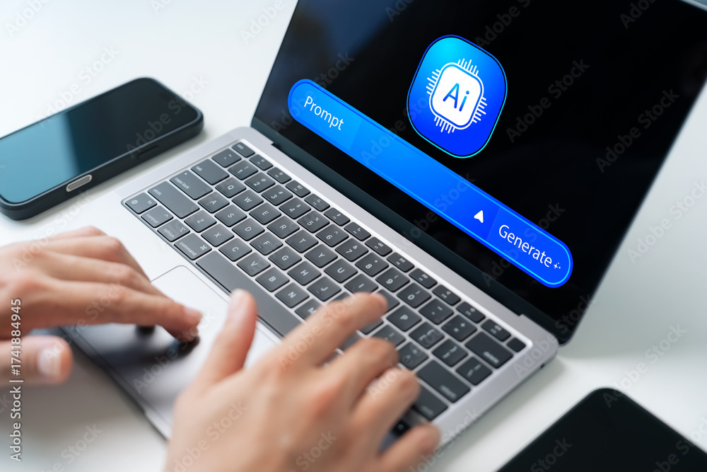 Content creation with AI assistants and agents, users typing prompts on laptops with AI interfaces, working with artificial intelligence in business and education, automation digital transformation.
