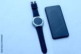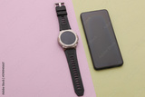 Modern gadgets. Smartphone and Smart watch on pastel background