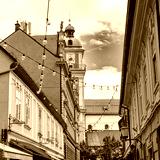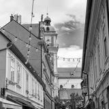 Narrow alleys decorated with strips of light bulbs in the city center of Maribor, Slovenia.