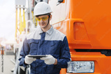 Male worker with tablet on background big truck, AI equipment in mining industry