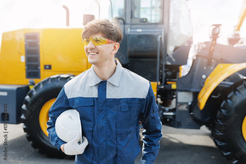 Portrait Happy industry worker relax after work, Young Caucasian male in mining industry with machinery and safety gear