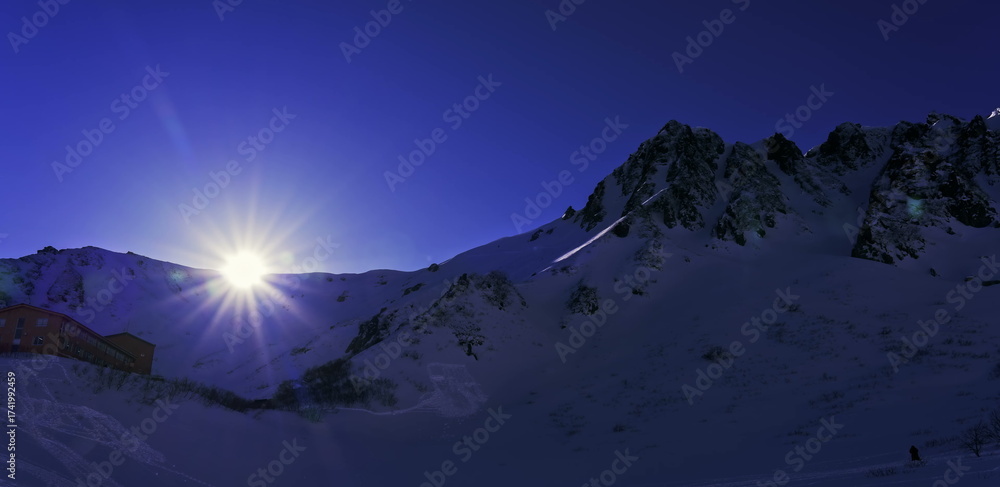 Golden sunlight bursts across snowy peaks as shadows stretch slopes
