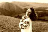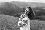 Woman in traditional vyshyvanka dress on mountain hillside.
