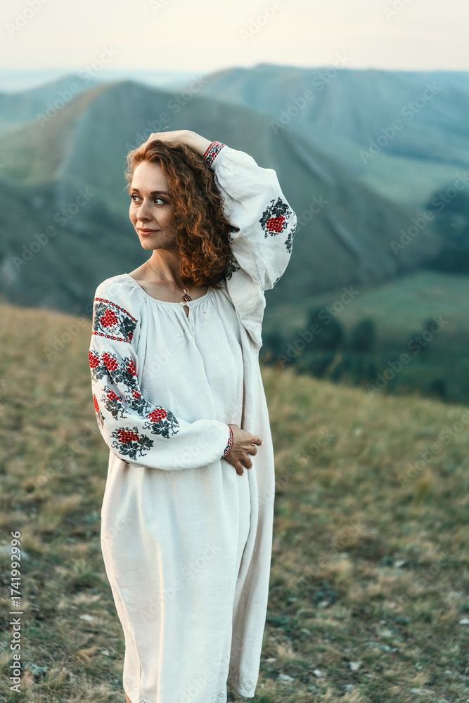 Woman in traditional vyshyvanka dress on mountain hillside.