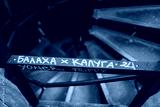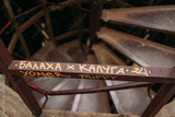 Close-up of rusty metal stair railing with hand-painted Cyrillic graffiti, shallow depth of field, urban decay mood, spiral steps in soft light