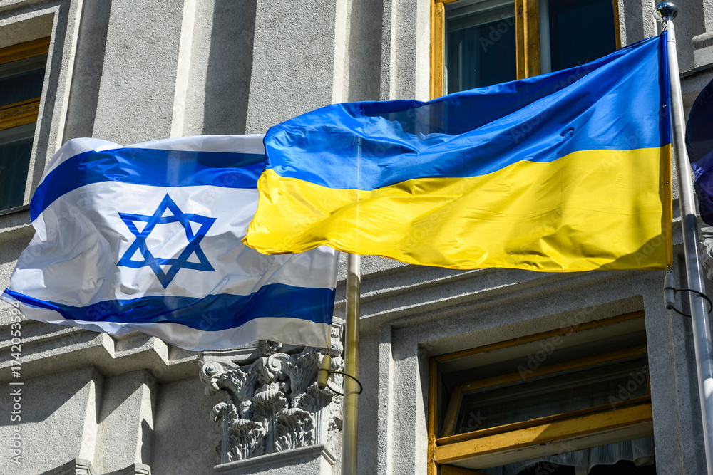 The national flags of Ukraine and Israel wave on flagpoles near an administrative building under bright sunlight, symbolizing diplomatic ties, political cooperation, and mutual support.