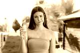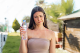Young Brazilian woman with a bottle of water at outdoors with sad expression