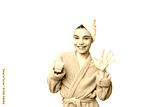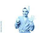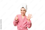 Little girl in a bathrobe over isolated chroma key background counting six with fingers