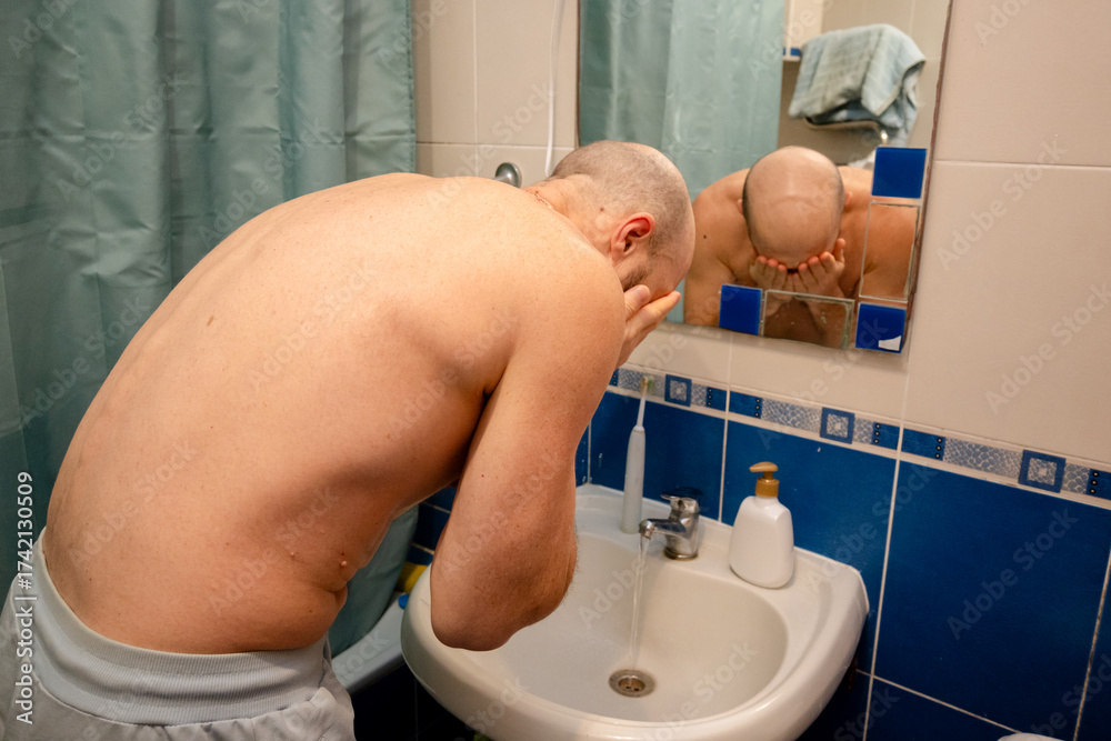 Man washing face in bathroom sink, reflected in mirror. Capturing a moment of daily personal hygiene and refreshment during a morning routine.