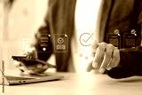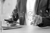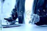 Checklist Businessman marks Document on digital checklist, representing quality assurance and document control process. ISO certified business, compliance with international standards quality .