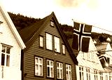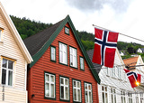 Traditional wooden houses of Bryggen, Bergen displaying Norwegian flags against a cloudy sky