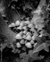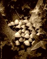 Group of Mica cap or Glistening ink cap (Coprinellus micaceus) mushroom forming fungi at the base of a tree surrounded by ivy in a woodland in France