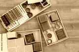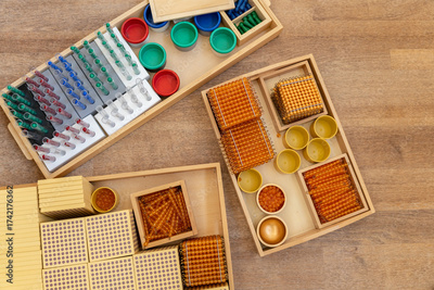 Montessori boxes with materials for alternative learning of mathematics, algebra, geometry, arithmetic in elementary school. Montessori education.