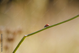 Red Ladybug (Coccinella septempunctata or seven-spot ladybird) On A Curved Grass Blade In Soft Golden Background, close up