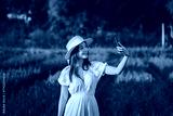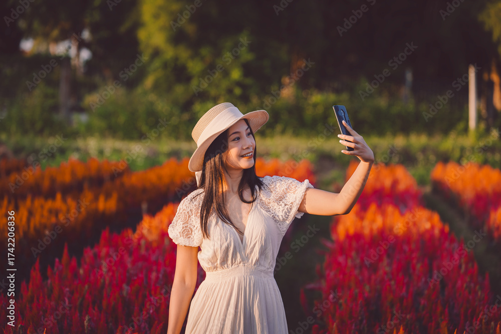 Happy traveler asian woman with dress use mobile phone for selfie on red Celosia flower field in garden at Chiang Mai Thailand Winter travel holiday vacation concept
