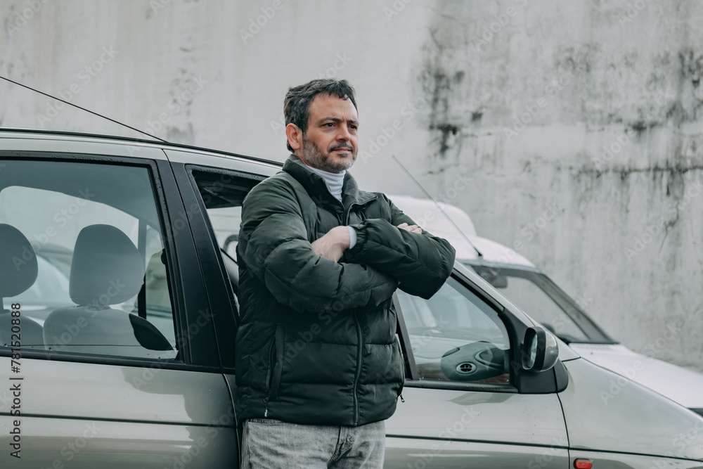 Four lit advent candles. Burning candles for the fourth advent. Outdoors christmas decoration with four white candles in front of a garden backtrop and space for text.