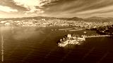 Aerial View of Pigeon Island (Güvercinada) in Kusadasi, Turkey – Historic Fortress Surrounded by the Aegean Sea under Light Clouds