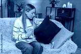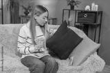 Caucasian woman girl at home sofa counting dollar cash looking confused searching missing banknote under pillows. Relieved smiling after finding lost money modern digital lifestyle finance emotion