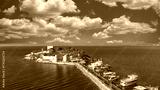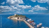 Aerial View of Pigeon Island (Güvercinada) in Kusadasi, Turkey – Historic Fortress Surrounded by the Aegean Sea under Light Clouds