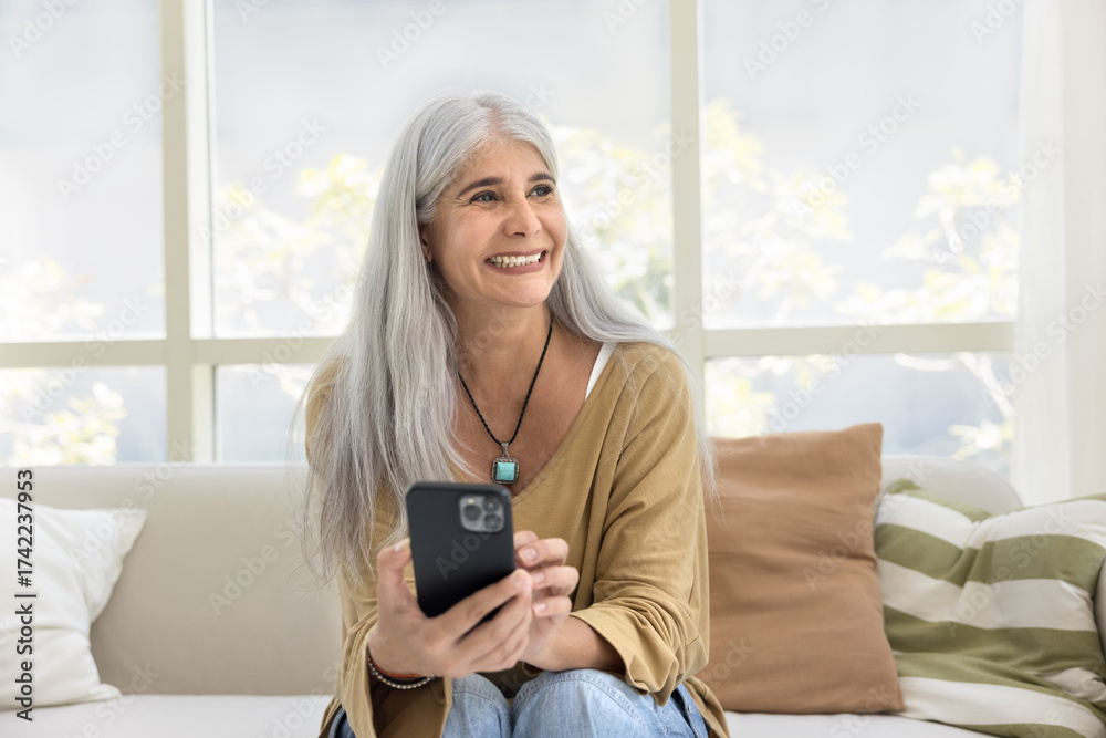 Happy long grey haired senior lady holding smartphone at home