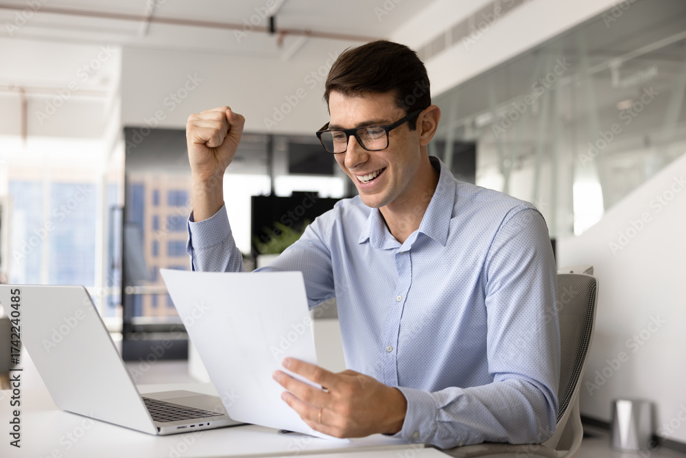 Excited joyful young Latin businessman in eyeglasses making winner gesture