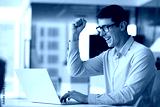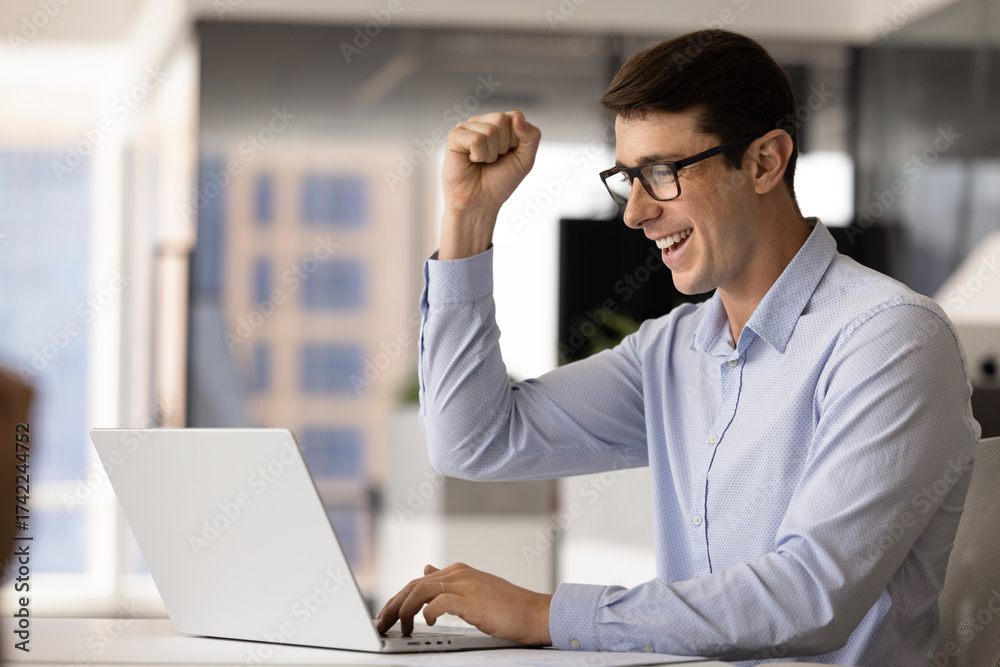 Cheerful emotional Hispanic manager man celebrating ebusiness success