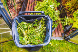 Autumn greenhouse cleaning with removed tomato plants collected in black trash bin after harvest. Sweden.