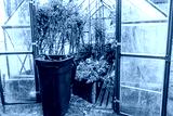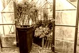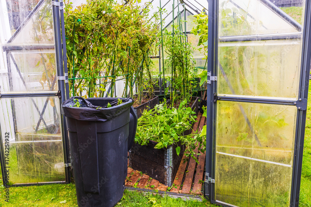 End of autumn season greenhouse cleaning with tomato plants removed and garden waste collected. Sweden.
